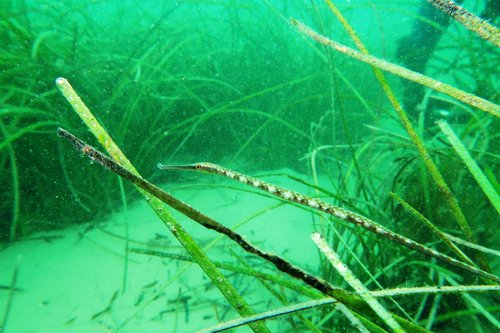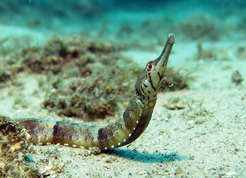The pipefishes and ghost pipefishes are among the closest relatives to seahorses and seadragons. Similar to those groups, these fishes have elongated snouts for capturing small prey and are extremely well-camouflaged.